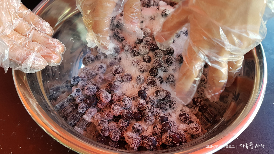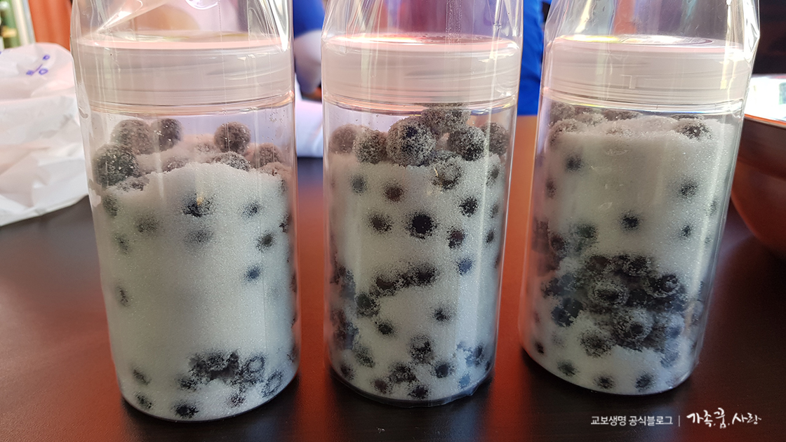 블루베리 따기 체험 후에는 블루베리청을 만들었어요. 깨끗하게 씻은 후 물기를 말린 블루베리와 설탕을 1대1로 넣고 섞으면 완성입니다. 복잡하지 않지만 아이들은 굉장히 재미있어 합니다. 눈을 만지는 것처럼 ‘뽀드득한’ 느낌인데, 직접 체험해보면 더 생생함을 느낄 수 있습니다.