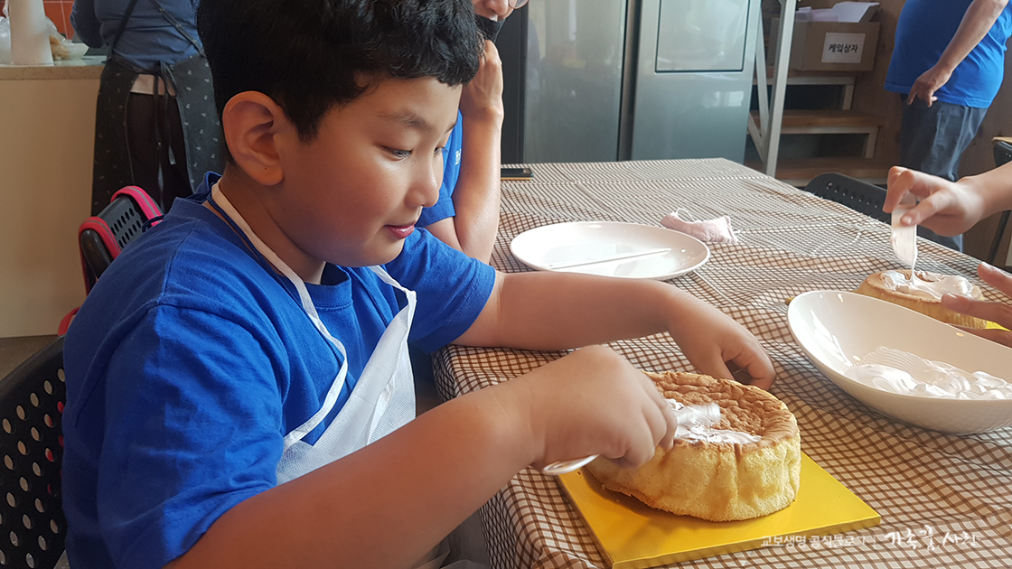 이제부터는 아이가 솜씨를 마음껏 발휘할 시간입니다. 케익 시트 위에 생크림을 골고루 바르고, 예쁘게 토핑을 올려주면 케이크 만들기는 마무리됩니다. 케이크를 만드는 동안 공방 안은 신난 아이들로 왁자지껄합니다. 재미있어하는 아이들을 보고 있으면 동심으로 빠져드는 기분입니다.