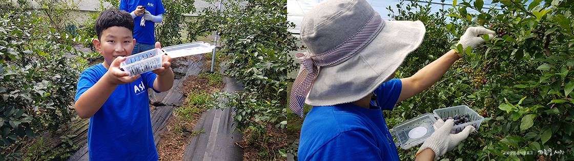 아이들은 수확하는 즐거움에 신이 나서 밭고랑을 이리저리 뛰어다니며 블루베리를 따기 바쁩니다. 새콤달콤하면서도 싱싱한 블루베리를 실컷 먹을 수 있어서 더 즐거운 듯합니다.