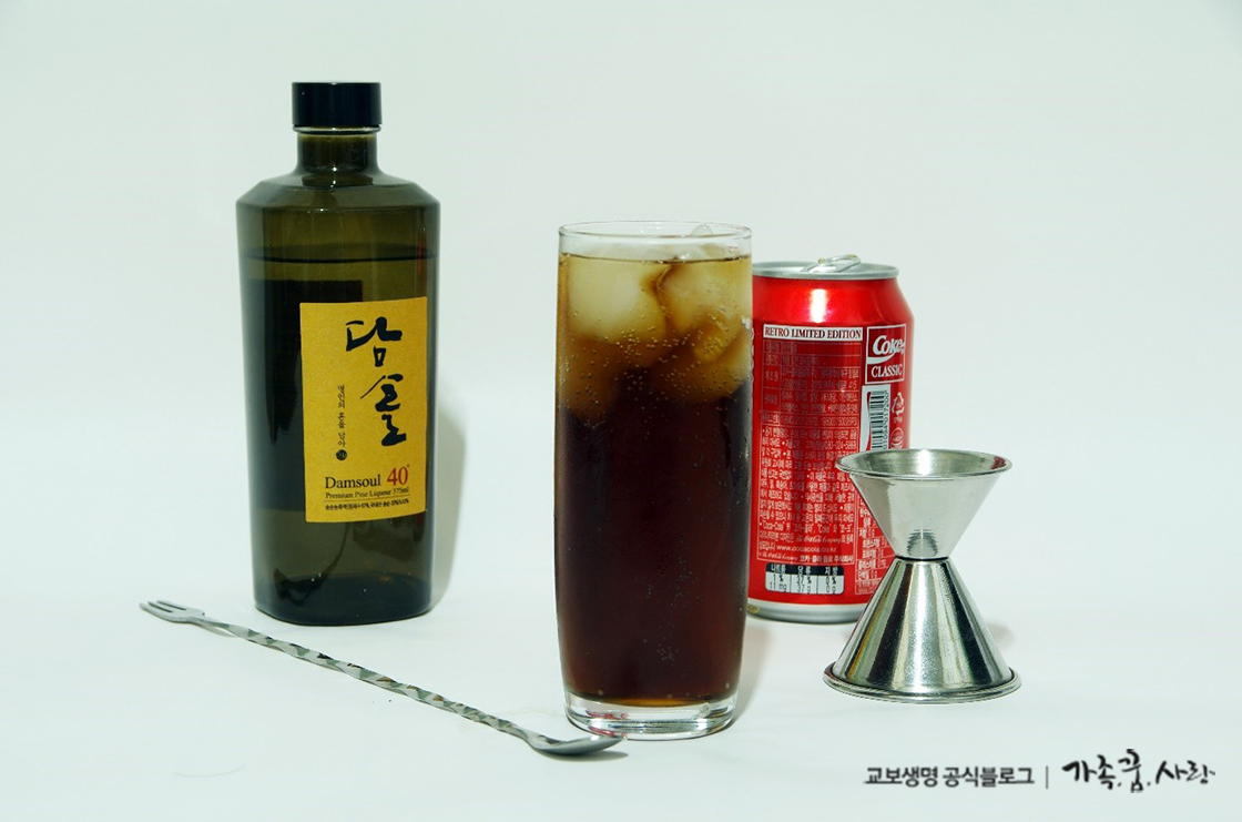 만드는 방법은 정말 간단해요. 기다란 컵을 하나 준비해서 1/5 정도 담솔40을 담습니다. 그다음 얼음을 넣고 저어준 뒤, 콜라를 가득 채워주면 끝!