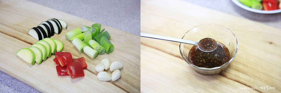 가지와 호박은 길게 반으로 자른 후 반달 썰기로 꽂기 좋게 손질하고, 대파와 파프리카는 닭가슴살 크기에 맞게 썰어 줍니다. 통마늘은 그대로 사용해도 됩니다. 양념장은 재료를 모두 넣고 잘 섞어 주면 완성입니다.