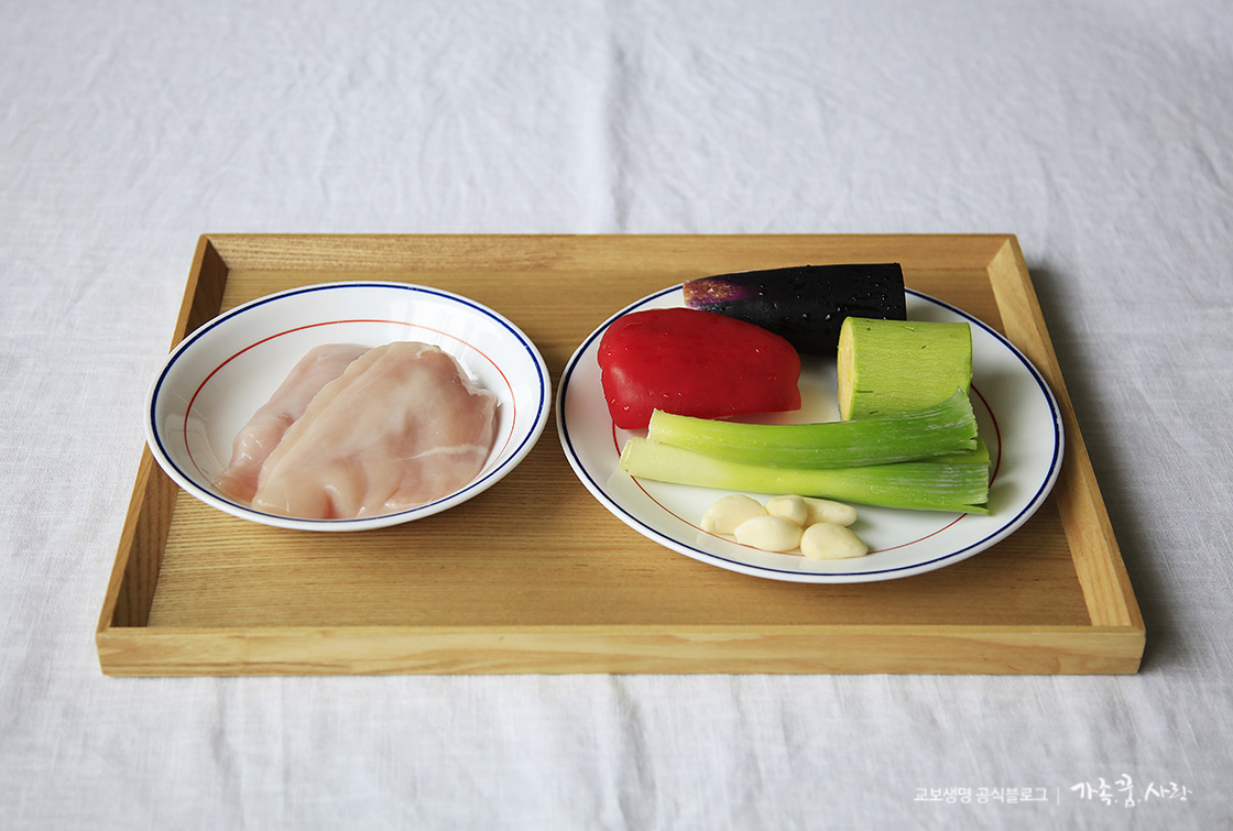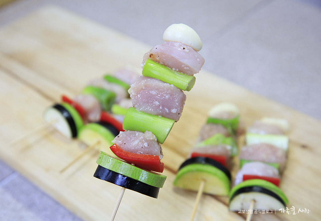 닭꼬치 재료: 닭가슴살 200g, 대파 1대, 통마늘 5개, 호박, 가지, 파프리카 약간씩