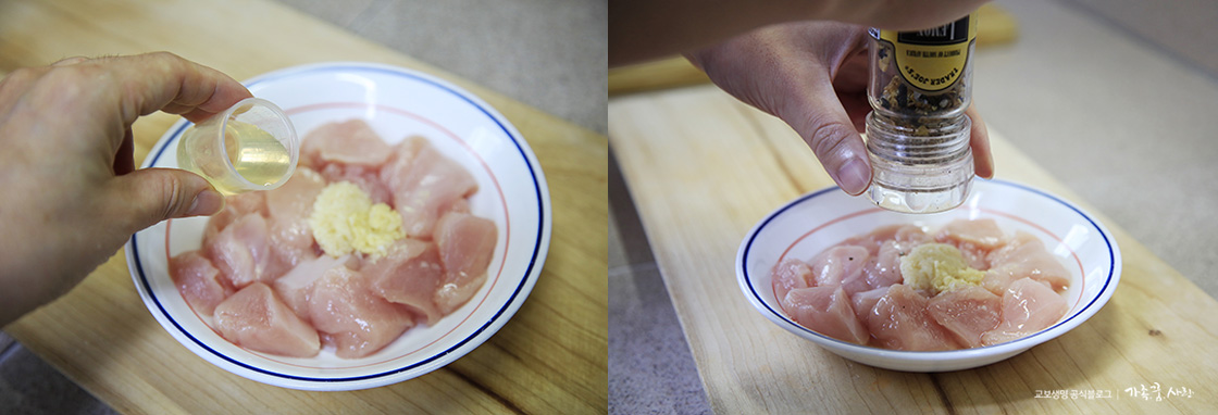 닭가슴살 밑간재료: 다진 마늘 1 티스푼, 다진 생강 1/2 티스푼, 맛술 1스푼, 소금 후추 약간