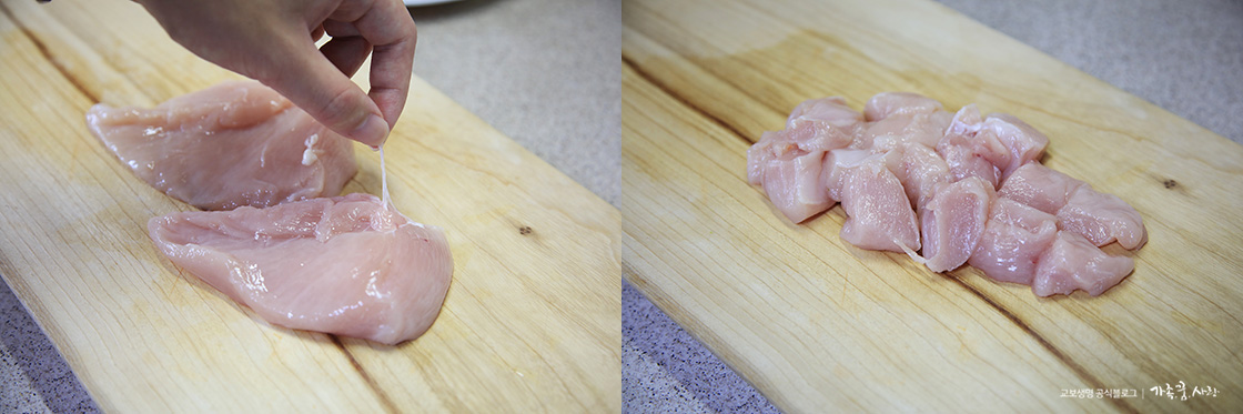 신선한 닭가슴살은 연한 분홍빛이 돌면서 윤기가 있고 투명한 느낌이 나요. 신선한 닭가슴살을 고른 다음 가장 먼저 해야 하는 건 닭가슴살 손질입니다. 깨끗이 씻어 키친타월로 물기를 제거하고, 가장자리에 하얗게 둘러져 있는 기름띠를 떼어내 꼬지에 꽂을 적당한 크기로 잘라 주세요. 냉장육이 아닌 냉동육을 구입하면 냉장실로 옮겨 천천히 해동해서 사용해야 육질과 육즙을 지켜 더 맛있게 먹을 수 있어요.