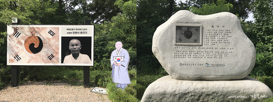 진관사 입구에 독립운동 유물 발견을 기념해 세운 태극기 비에는 당시 발견된 독립신문 1면의 ‘태극기’라는 제목의 시 일부를 새겨 애국정신을 기리고 있습니다.