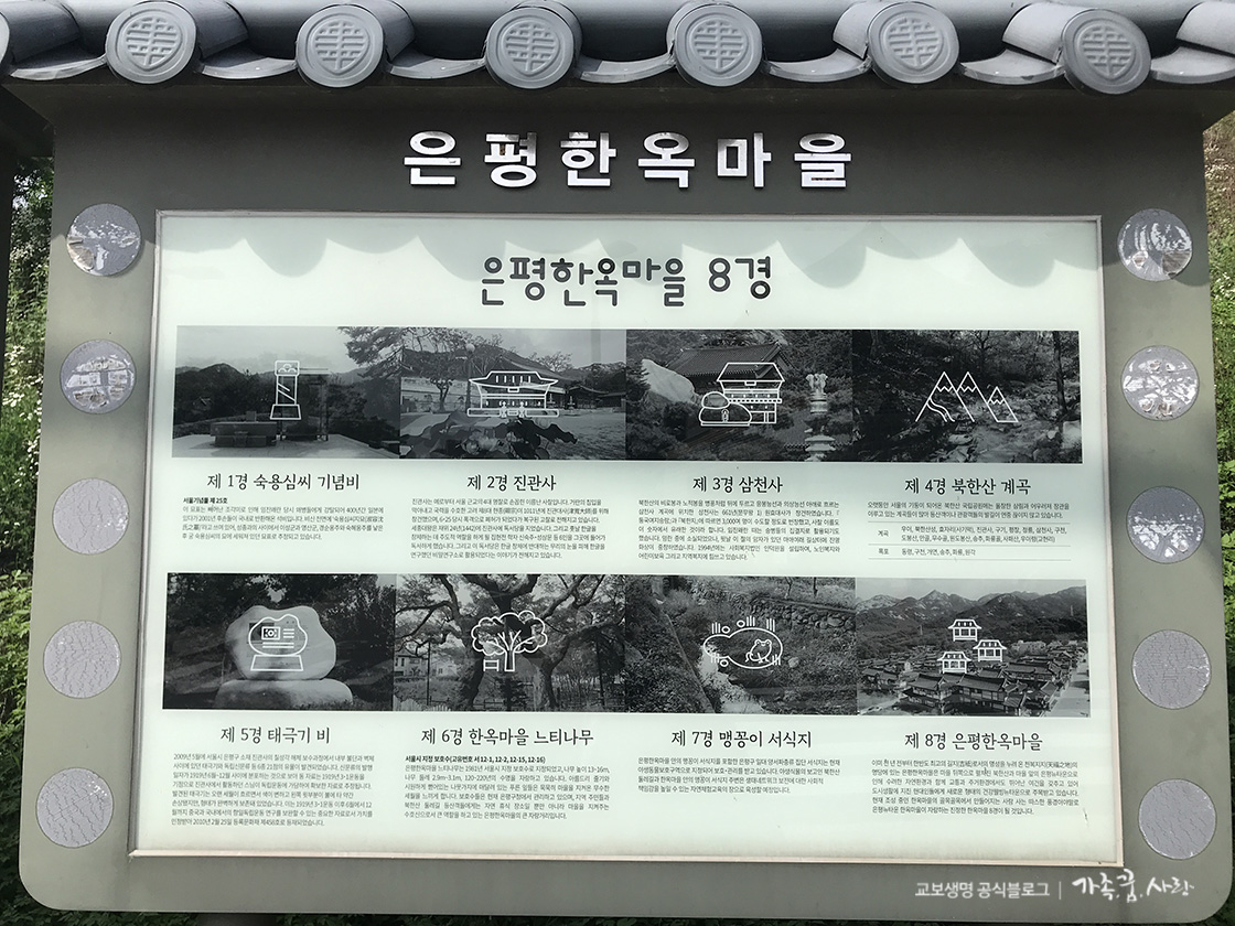 오래전부터 명당으로 소문난 만큼 진관사와 삼천사 외에 '은평한옥마을' 주변에는 유서 깊은 곳이 많습니다. 이를 모아 ‘은평한옥마을 8경’이라고 부르죠. 8경에는 숙용심씨 기념비, 진관사, 삼천사, 북한산 계곡, 태극기 비, 한옥마을 느티나무, 맹꽁이 서식지, 은평한옥마을이 있습니다.