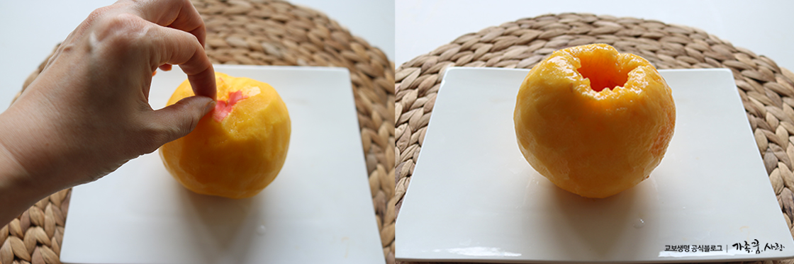3. 복숭아 껍질을 얇게 벗겨준 다음 씨를 도려낸 부분이 위로 오게 놓습니다.