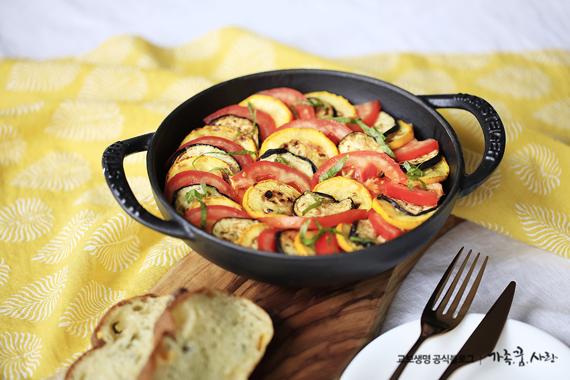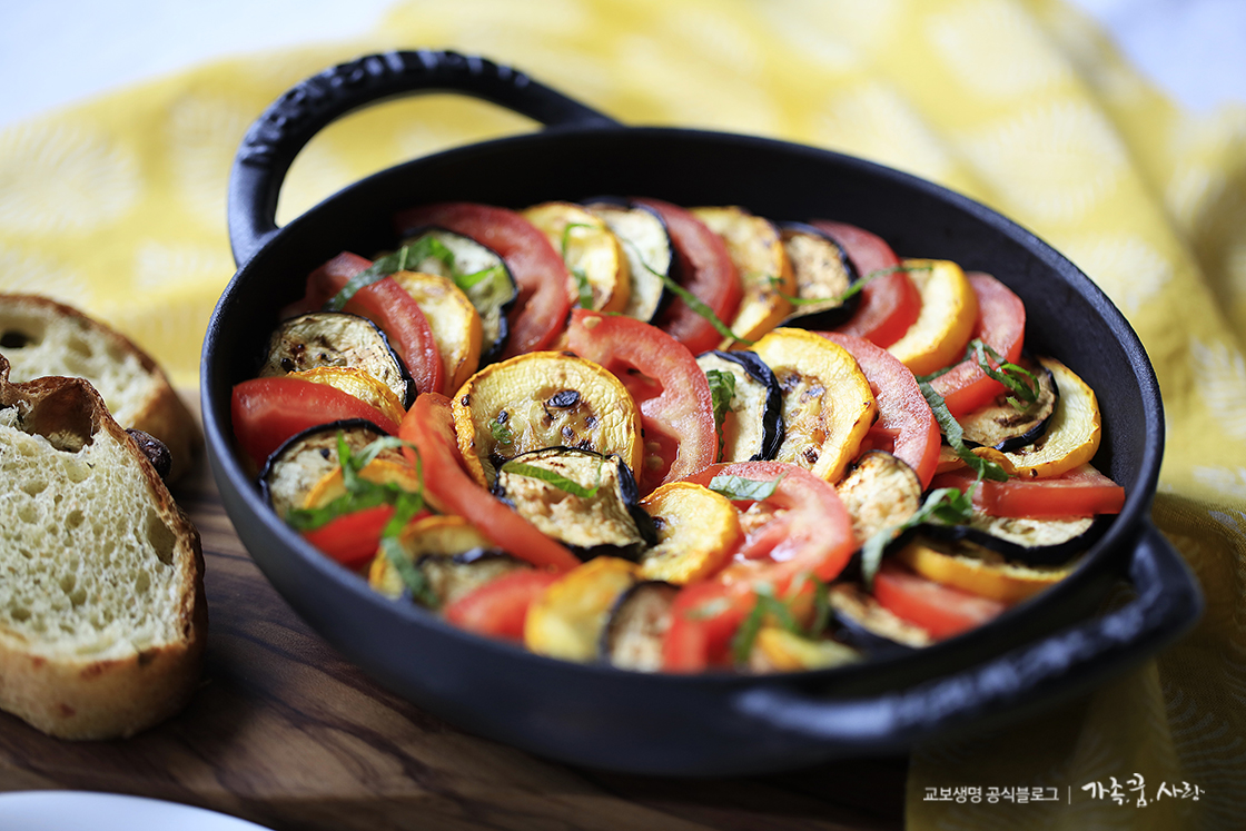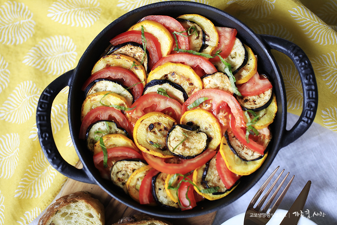 지금까지 다양한 여름 채소로 라따뚜이를 만들어봤는데요, 꼭 이 재료가 아니더라도 냉장고 안에 있는 재료를 활용해서 나만의 라따뚜이를 만들어도 좋을 것 같아요. 예쁜 비주얼만큼 맛도 영양도 풍부해 여름이 가기 전 한 번쯤 만들어 보면 좋은 요리예요. 오븐이 없어도 누구나 만들기 쉽고 재료도 간단한 여름 제철 요리, 라따뚜이입니다!