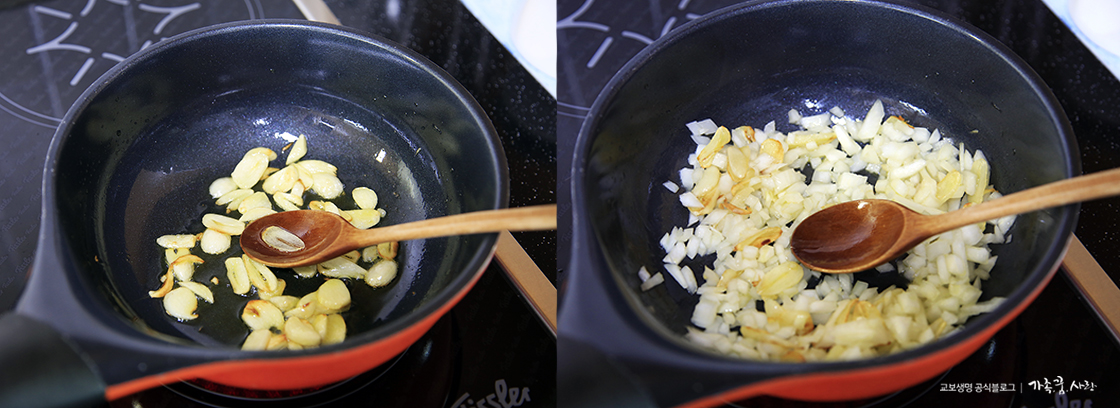 4. 올리브오일을 넉넉히 붓고 마늘향이 날 때까지 노릇노릇 구워주고 이어 다진 양파 넣고 볶다가 나머지 채소도 넣고 볶아주세요.