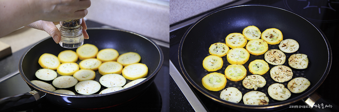 3. 아무것도 두르지 않은 달군 팬에 가지와 호박을 올리고 소금, 후추 약간씩 뿌려 앞뒤로 구워주세요.