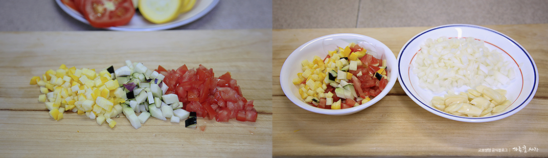 2. 양파는 곱게 다지 듯 썰고, 마늘은 편으로 얇게 썰고, 사용하고 남은 가지, 호박, 토마토자투리도 곱게 썰어 한데 담아주세요.