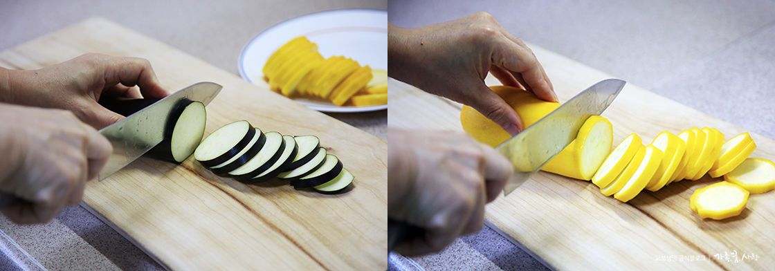 1. 가지, 호박, 토마토는 모양대로 너무 두껍지 않게 적당한 두께로 썰어 주세요.