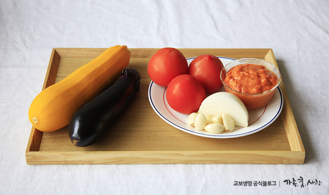 준비 재료: 가지 1개, 돼지호박(다른 종류 호박도 가능) 1개, 토마토 3개, 양파 1/4개, 통마늘 6개, 토마토소스 1컵, 소금, 후추, 올리브오일