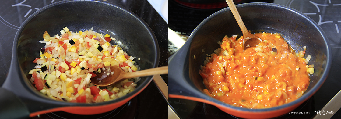 5. 토마토소스 넣고 뭉근히 약한 불에서 끓여주세요. 소금, 후추로 간을 맞춰 주세요.