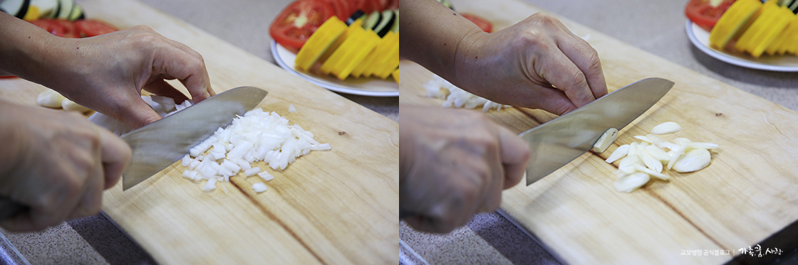 2. 양파는 곱게 다지 듯 썰고, 마늘은 편으로 얇게 썰고, 사용하고 남은 가지, 호박, 토마토자투리도 곱게 썰어 한데 담아주세요.