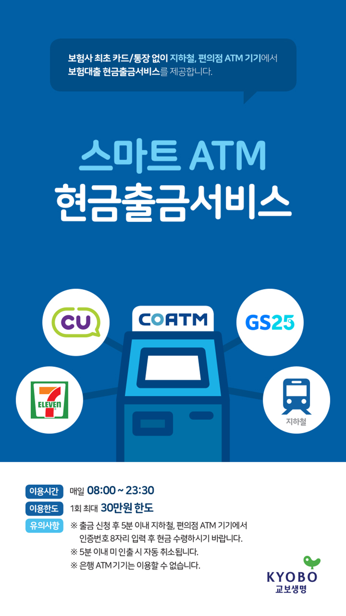 ‘보험계약대출 스마트출금 서비스’란 실물카드 없이도 편의점이나 지하철 현금자동입출금기(ATM)에서 보험계약대출로 현금을 출금할 수 있는 서비스에요.