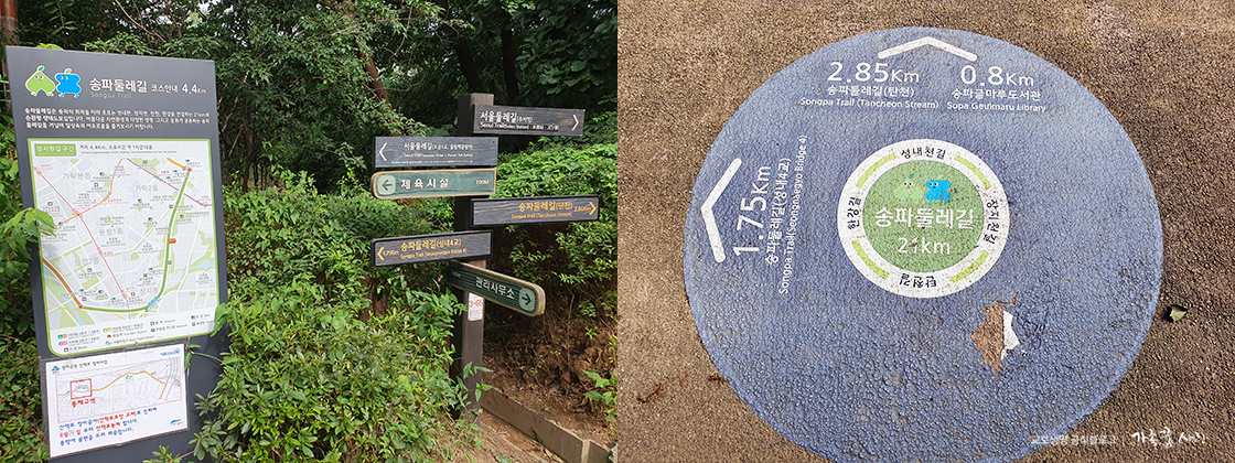 송파둘레길은 곳곳에 안내 표지판, 방향 안내표지판, 바닥 표지 등이 있어서 어렵지 않게 원하는 코스를 찾을 수 있어요. 특히 바닥 표지는 방향 감각이 없는 사람들에게 좋은 안내판이 되어줍니다.