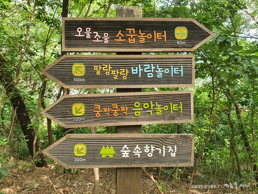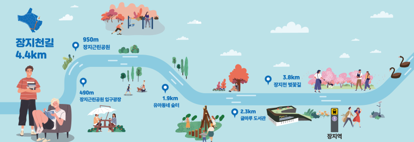 장지천길에는 오물조물 소꿉놀이터, 팔랑팔랑 바람놀이터, 쿵짝쿵짝 음악놀이터, 숲속향기집이라는 귀여운 이름의 유아놀이터가 있습니다. 어린 자녀가 있다면 이곳에서 맑은 공기를 마시며 온몸으로 자연을 느끼는 행복한 시간을 가져보면 어떨까요?