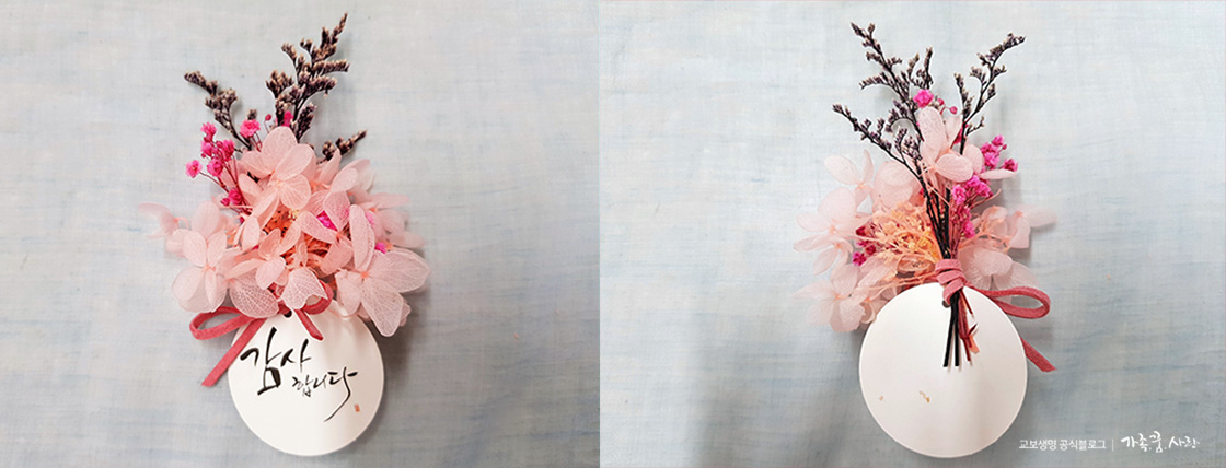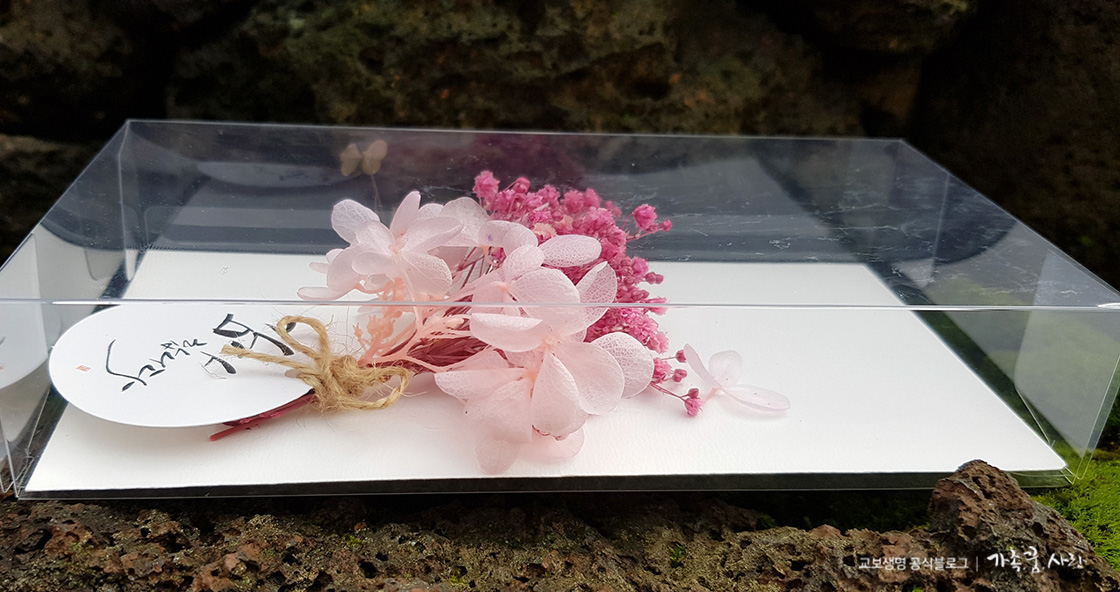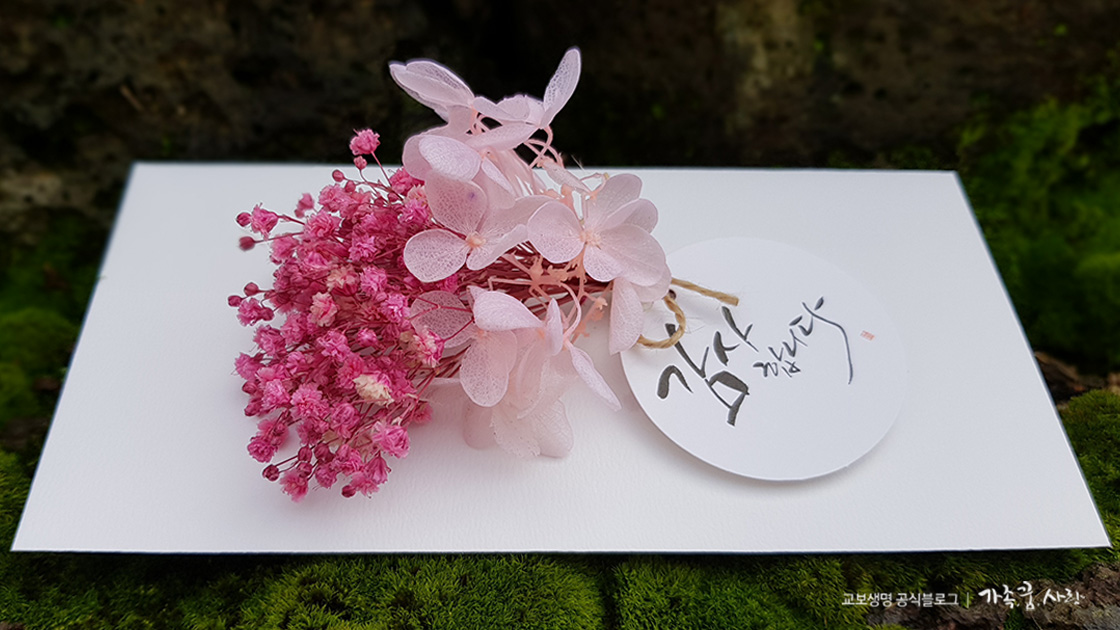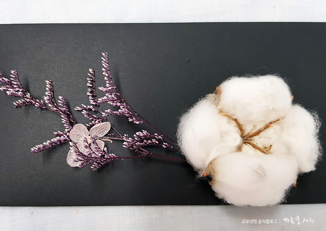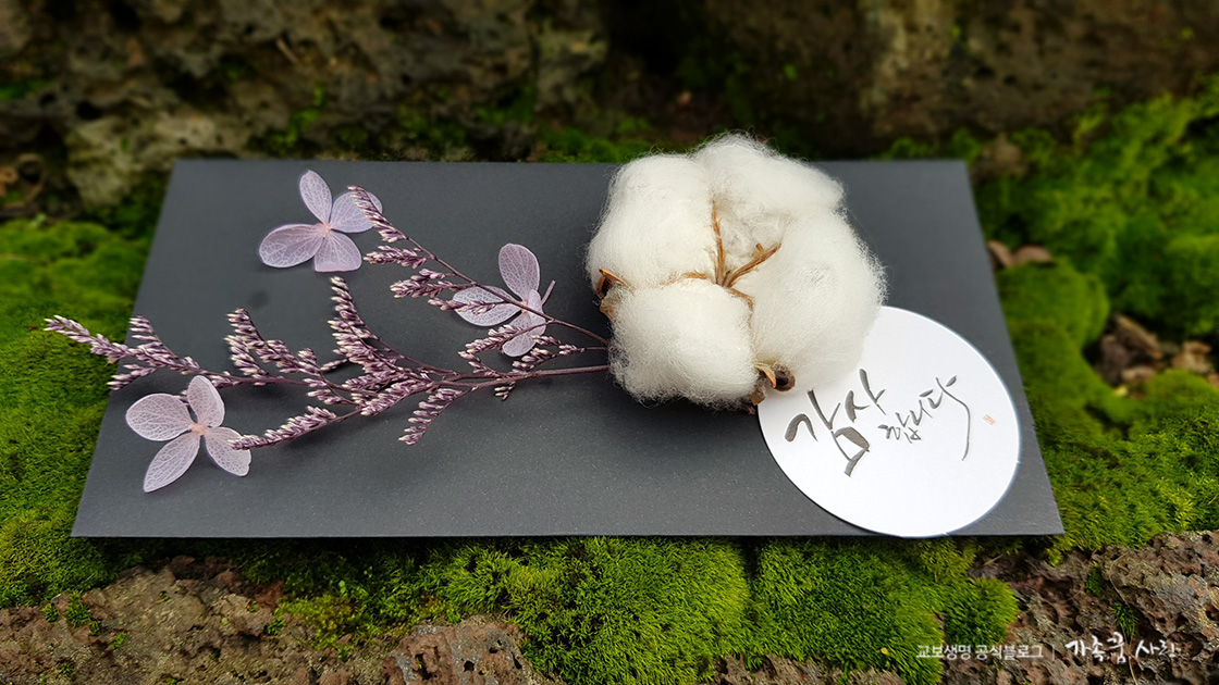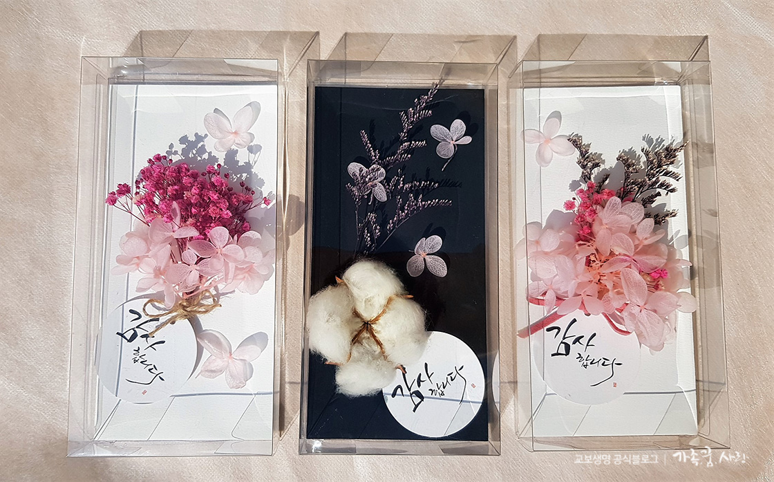 지금까지 프리저브드 플라워를 사용해 플라워 카드를 만들어봤습니다. 화사한 프리저브드 플라워로 만든 데다가 투명 상자에 넣어서 그런지 일반 봉투보다는 더 품격 있어 보입니다. 정성과 시간이 들어간 데다가 흔하지 않은 고급스러움까지 지니고 있어 선물의 가치가 더 높아진 느낌입니다. 이번 추석 명절에는 플라워 카드로 조금 더 특별한 선물 봉투를 준비해보면 어떨까요?