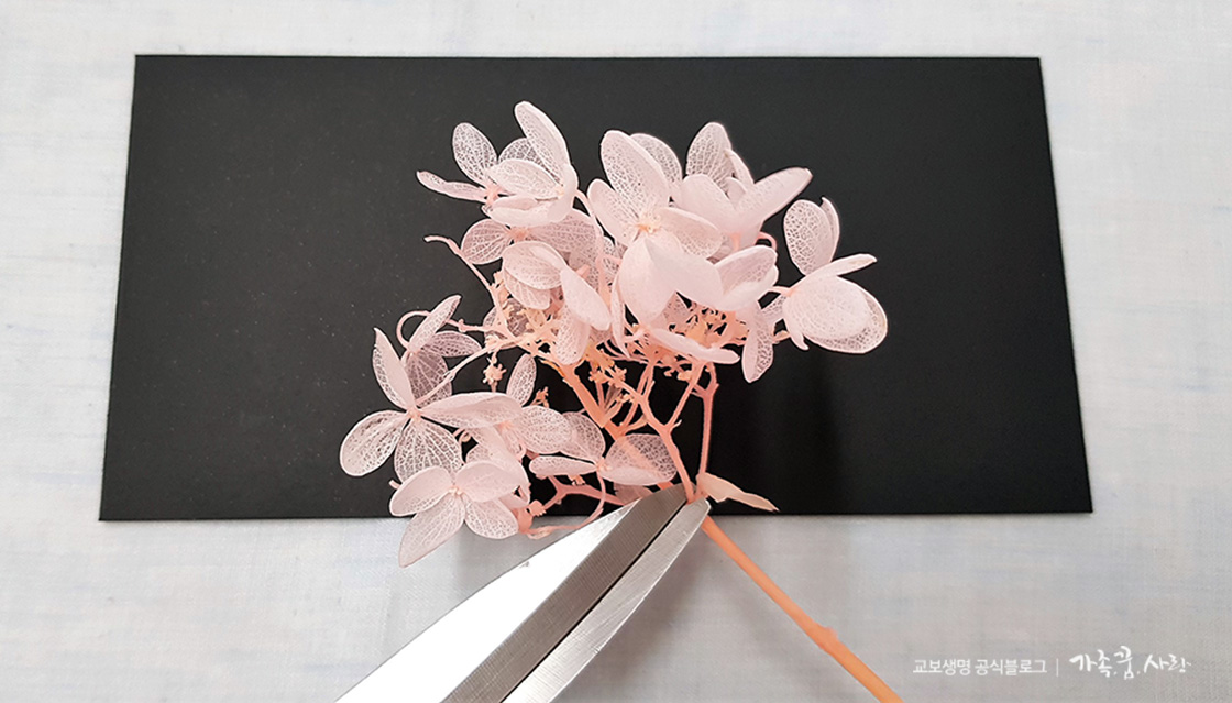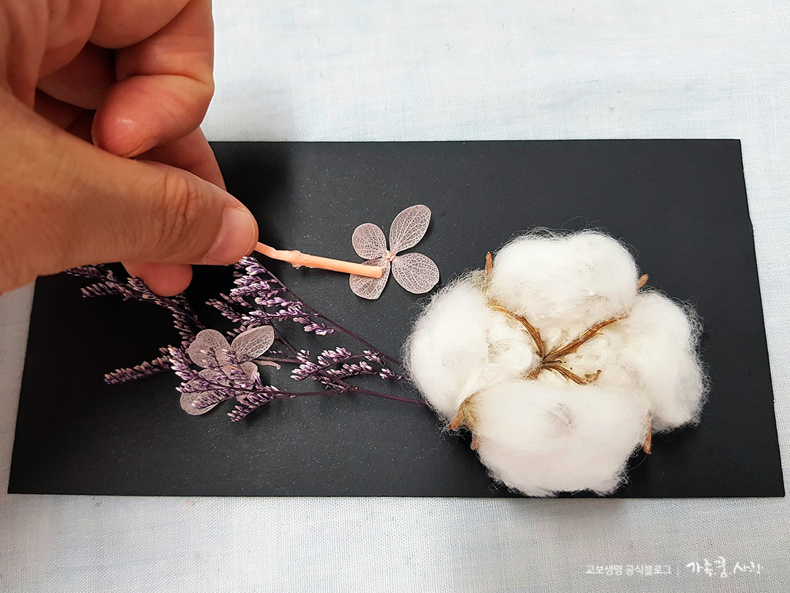 2. 미스티 블루 줄기와 수국 꽃잎을 잘라 원하는 곳에 배치합니다. 느낌을 보는 것이니 접착제는 바르지 않습니다. 그림을 그린다고 생각하면서 다양한 조합으로 배치를 해보세요.