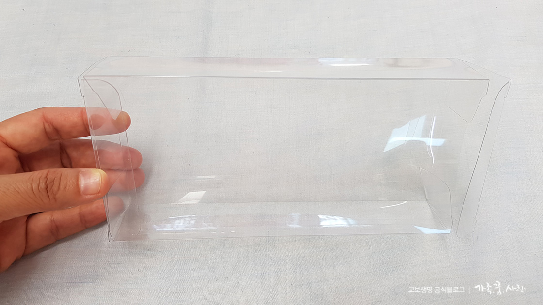 1. 투명 상자를 직사각형 박스 형태로 접어주세요. 표면에 지문이나 이물질이 잘 묻으니 조심해서 다뤄주세요. 라텍스 장갑이 있으면 제일 좋은데, 없다면 상자를 만든 후에 수건으로 한번 닦아주세요.