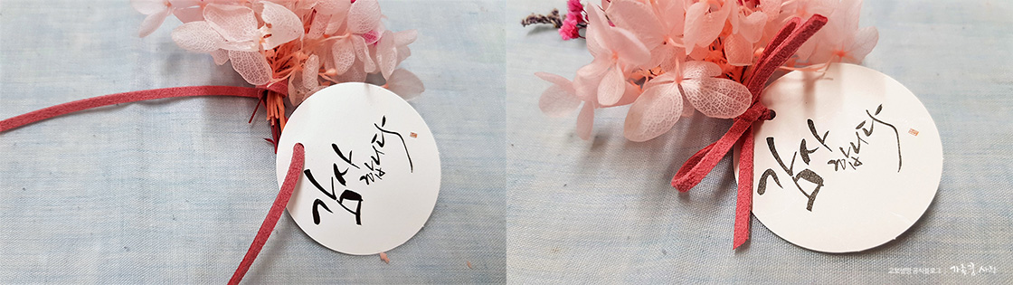 5. 감사말 스티커에 구멍을 뚫어 가죽 끈에 꿰어 준 다음, 예쁘게 리본 묶기를 하면 됩니다.
