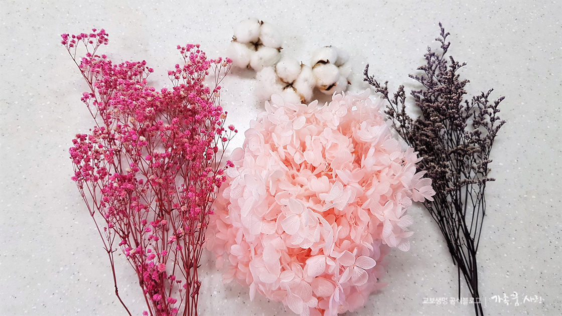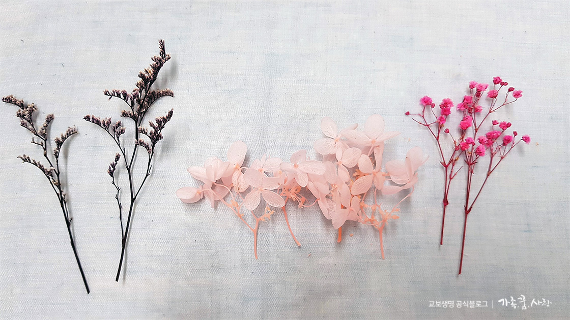 소개해드릴 특별한 봉투는 ‘플라워 카드’입니다. 봉투에 꽃을 붙여서 예쁘게 꾸미는 방식인데, 조금 특별한 재료가 필요합니다. 바로 프리저브드 플라워인데요. 생화를 특수 용액으로 가공 후 건조해 만들어, 색과 형태가 잘 변하지 않습니다. 색감도 생화보다 훨씬 화사하고 촉감도 부드러우면서 잘 부서지지 않아 인테리어 소품으로 많이 씁니다. 가공하기 때문에 생화보다 비싸지만 보관 기간을 생각하면 크게 부담되는 가격은 아닙니다. 직사광선과 고온, 습기를 피해야 오래 보관할 수 있으며, 꽃에 착색한 염료가 배어 나올 수 있어 옷에 묻지 않도록 조심해야 합니다.