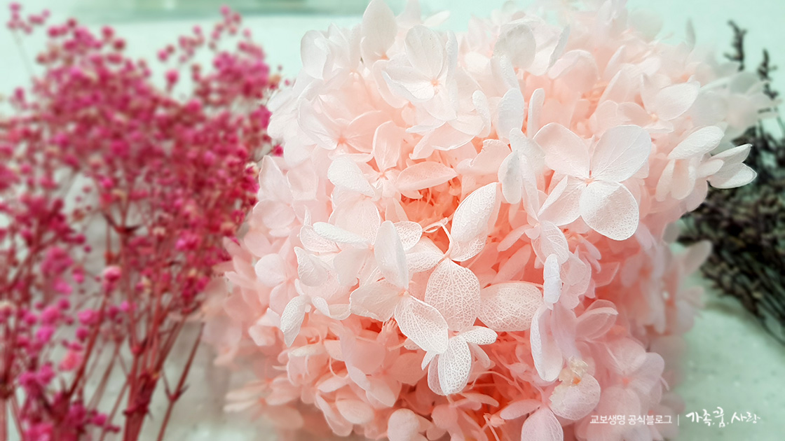 재료: 안개꽃, 수국, 미스티 블루(이상 프리저브드 플라워), 목화솜 등