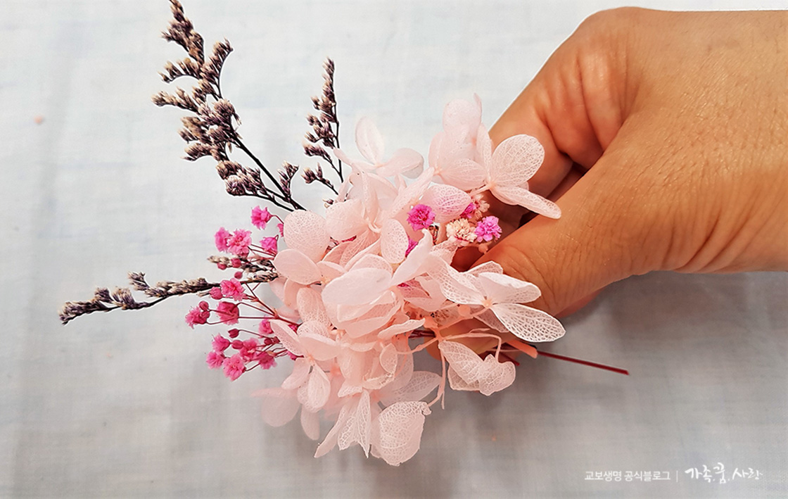 3. 프리저브드 플라워 위치를 정했으면 순간접착제를 발라 고정합니다. 코르사주 스타일과 달리 작은 꽃과 가지를 하나씩 붙이는 방식이라 조금 더 조심해야 합니다. 얇은 나무젓가락 같은 것을 이용해 접착제를 바르면 손에 묻지 않고 세밀하게 작업할 수 있어요. 마지막에 감사말 스티커를 붙이면 끝!