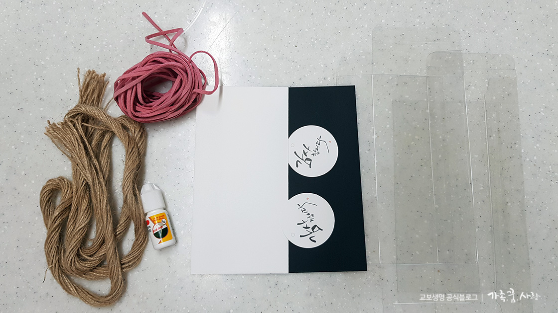 부재료: 용돈을 넣을 봉투와 노끈, 순간접착제, 투명 상자, 감사말 스티커, 가위