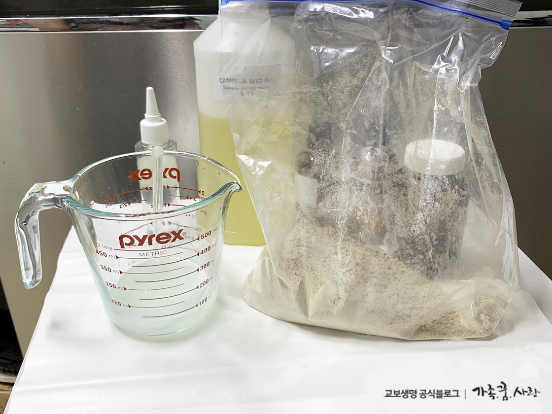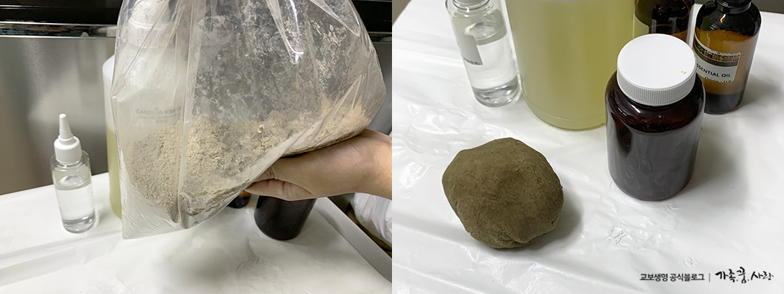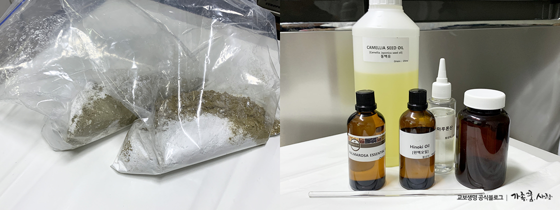 첨가 재료: 동백오일 3g, 티트리 아로마 오일 2g, 어성초 분말 15g