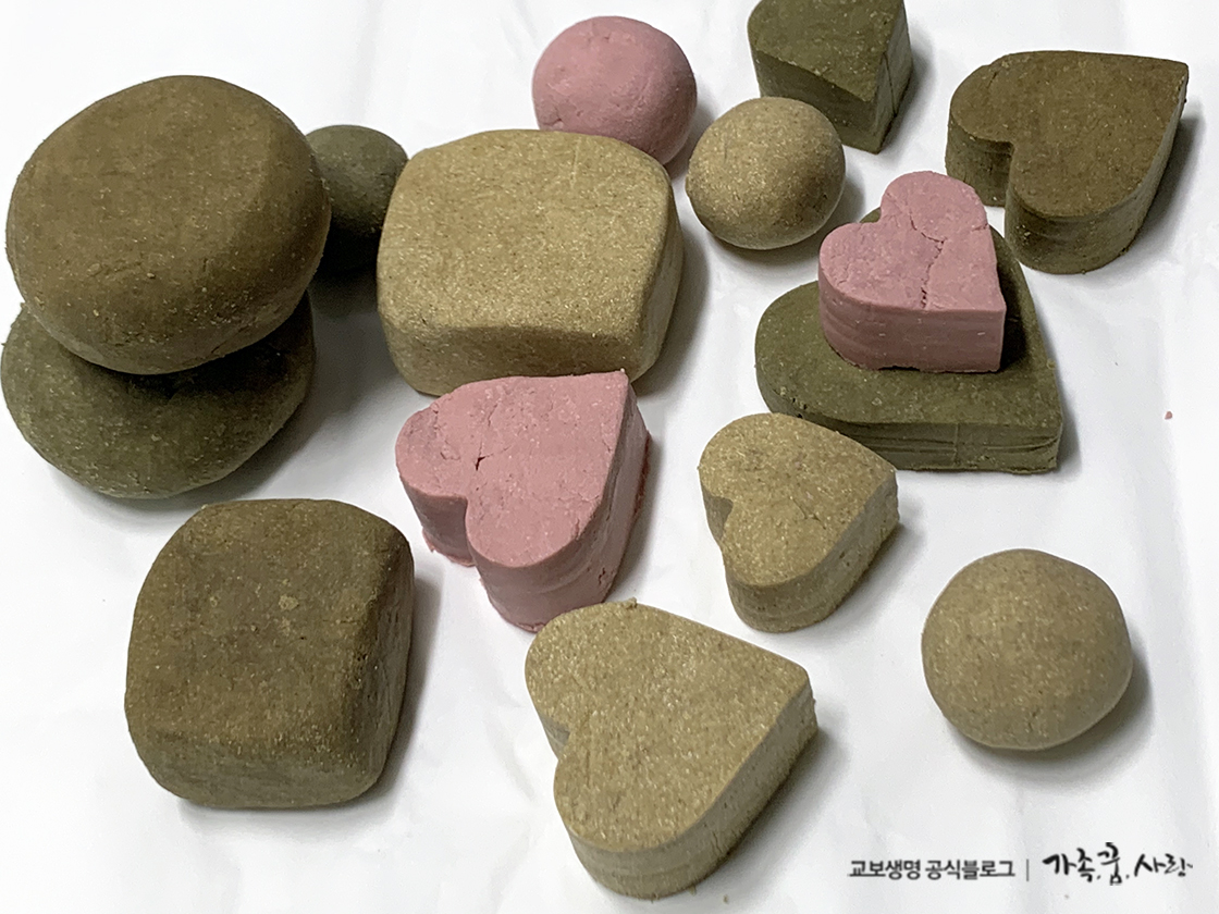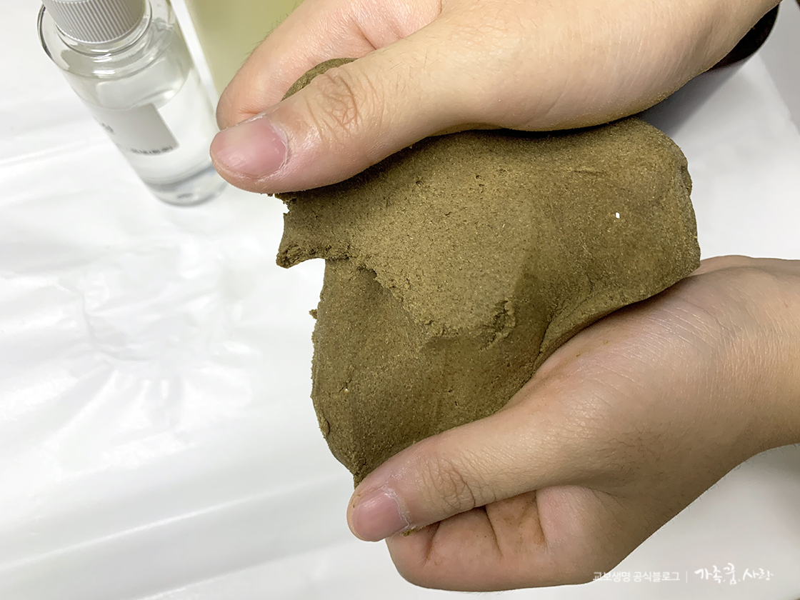잘 섞인 반죽을 지퍼백에서 꺼낸 후 반죽을 이용해 원하는 모양을 만들면 됩니다. 모양 틀을 이용하면 좀 더 예쁜 비누를 만들 수 있습니다.