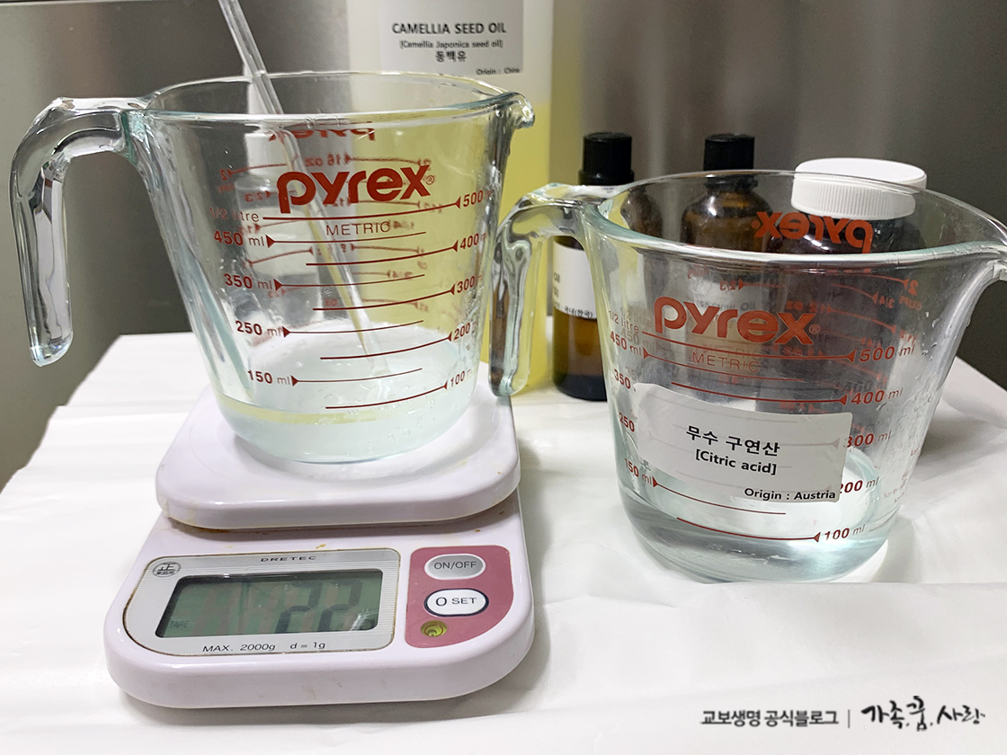 우선 LES, 히알루론산, 동백오일, 티트리 아로마 오일, 구연산(20% 용액)을 계량합니다. 구연산은 산도(pH)를 조절하기 위해서, 하알루론산은 피부 보습을 위해 필요합니다. 모두 인터넷 쇼핑몰에서 구할 수 있습니다. 동백 오일과 티트리 오일은 취향에 맞게 고르면 됩니다. 호호바 오일, 코코넛 오일 등 다양한 오일 중 내 피부에 맞는 것을 사용하면 되죠. 티트리 아로마 오일도 라벤더, 라임 아로마 오일 등으로 바꿔도 됩니다.