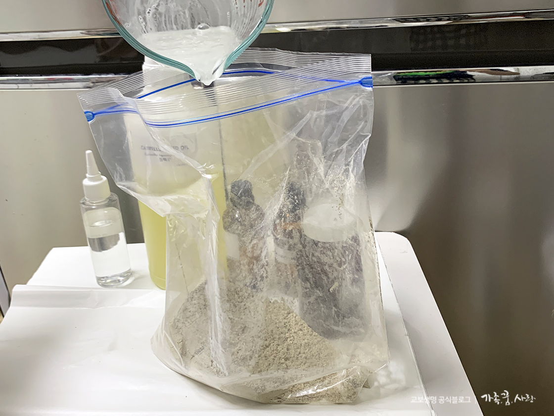 중성비누 파우더와 어성초 분말을 잘 섞었으면 여기에 앞서 준비한 필수 재료를 넣어줍니다. 지퍼백을 잘 잠그고 다시 한번 잘 섞어주세요.