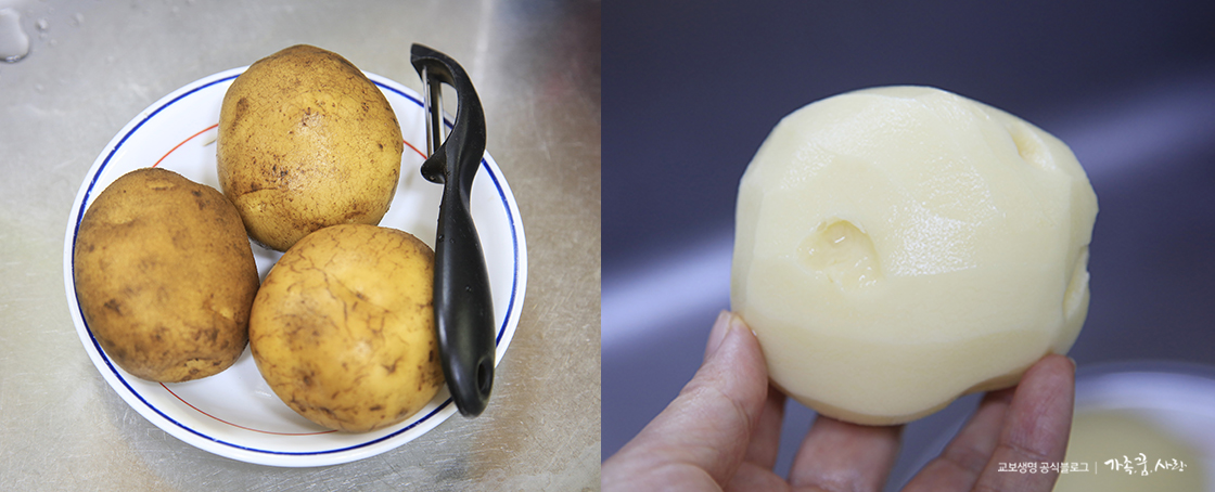 4. 감자는 필러를 이용해 껍질을 깨끗이 벗긴 후 씨눈이 있는 곳을 도려내 주세요.