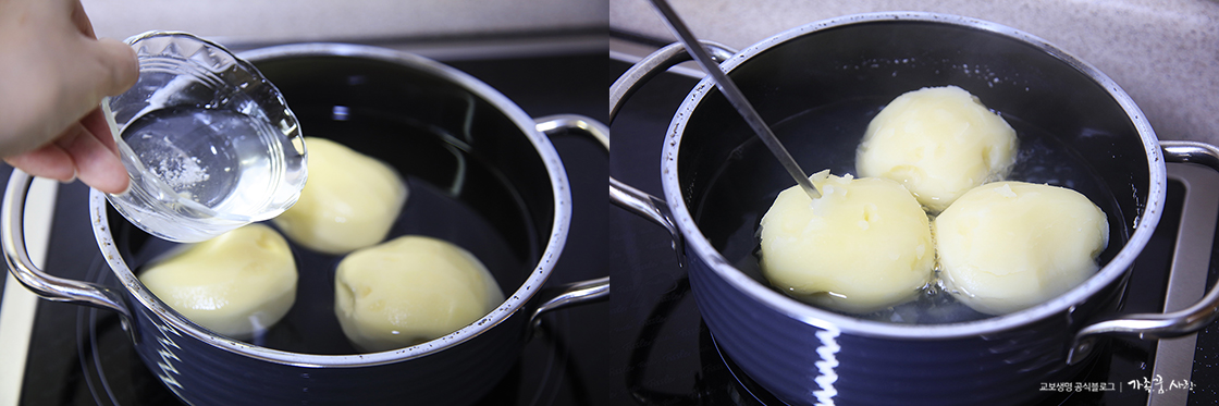 6. 감자 크기에 따라 찌는 시간은 다를 수 있어요. 젓가락으로 찔러 쑥 들어가면 다 된 겁니다. 사진에 있는 크기 정도면 큰 감자라 1개당 설탕 0.5스푼씩 총 1.5스푼의 설탕을 넣었어요. 소금은 0.5 티스푼 정도 넣었고요.