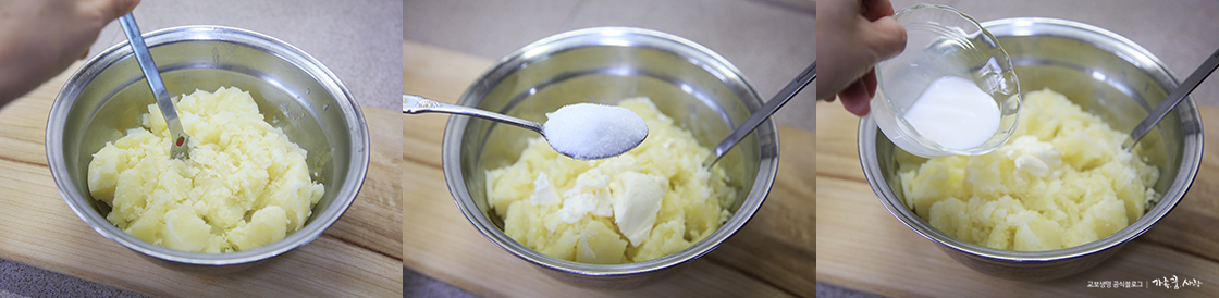 감자소 재료: 감자 3개, 설탕 2스푼, 마요네즈 2스푼, 우유 2스푼, 버터 2스푼, 소금 약간