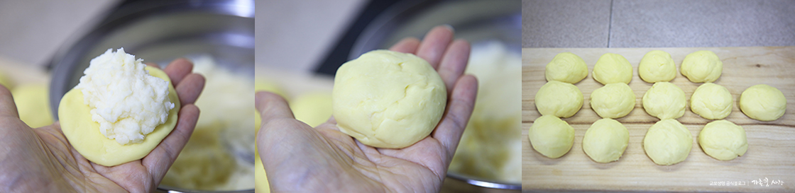 2. 반죽을 넓게 펴주고 감자소를 듬뿍 올린 다음, 반죽 끝을 감싸듯 모아 둥글게 모양을 잡아주세요. 믹스 1 봉지로 감자빵 13개 정도를 만들 수 있어요.