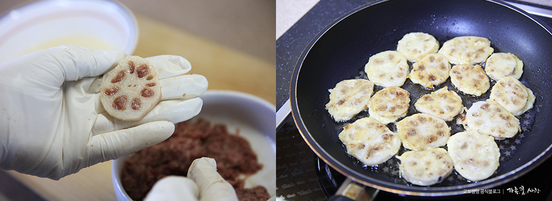 3. 연근 구멍에 다진 고기를 채운 후 반죽물을 입혀주세요.