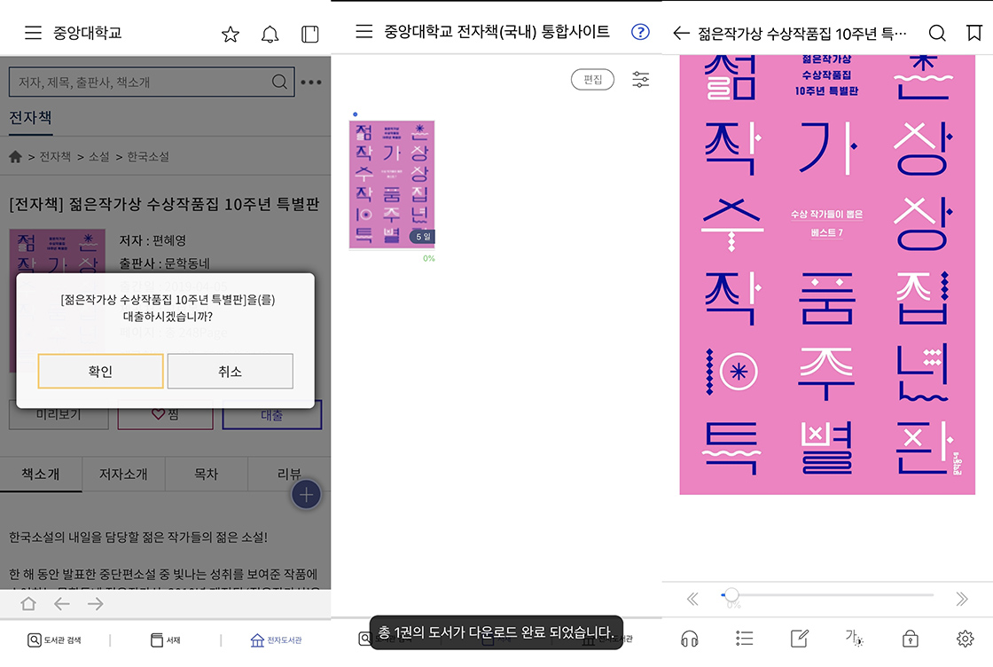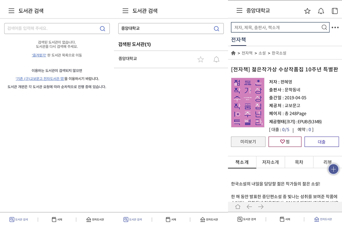 학교 전자도서관을 통해 전자책을 대출할 수 있습니다. 중앙대학교의 경우 교보문고 전자도서관을 이용하는데요. 앱 설치 후 학교를 검색하고, 로그인한 다음 책을 대출하면 ‘내 서재’에서 전자책이 들어옵니다. 이와 같이 재학 중인 학교가 어느 앱을 사용하는지 알아본 후 이용 안내에 따라 책을 빌리면 됩니다.