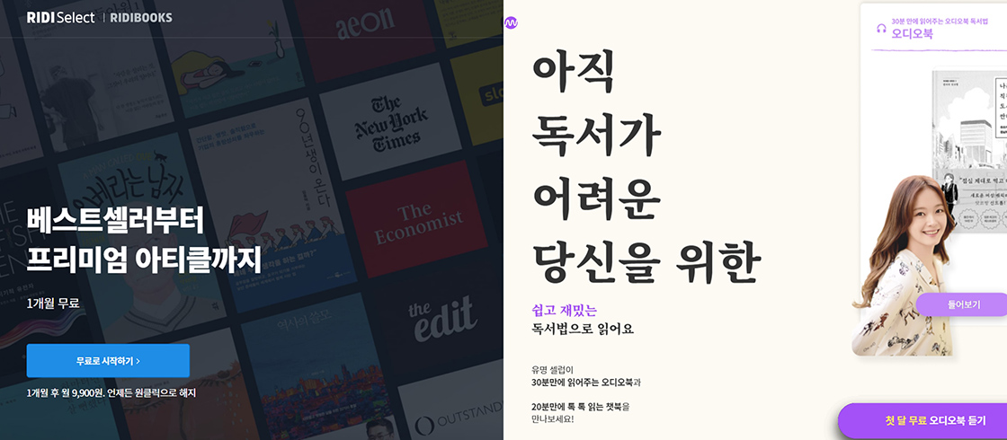 리디셀렉트는 프리미엄 아티클과 웹툰 등 다양한 콘텐츠를 이용할 수 있다는 것이 장점입니다. 또한 전자책 서점으로 유명한 리디북스에서 나온 플랫폼이기에 평소 리디북스에서 책을 즐겨 읽었다면 쉽게 이용할 수 있습니다. 다만 보유한 권 수가 다른 플랫폼에 비해 적은 편입니다.
