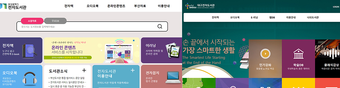 부산광역시 전자도서관은 6,000여 권의 전자책을 보유하고 있고, 대구 전자도서관은 95,000여 권의 전자책을 보유하고 있습니다. 이 외에도 두 전자도서관 모두 오디오북을 이용할 수 있고, 사이버 어학원 강좌를 수강할 수 있습니다.