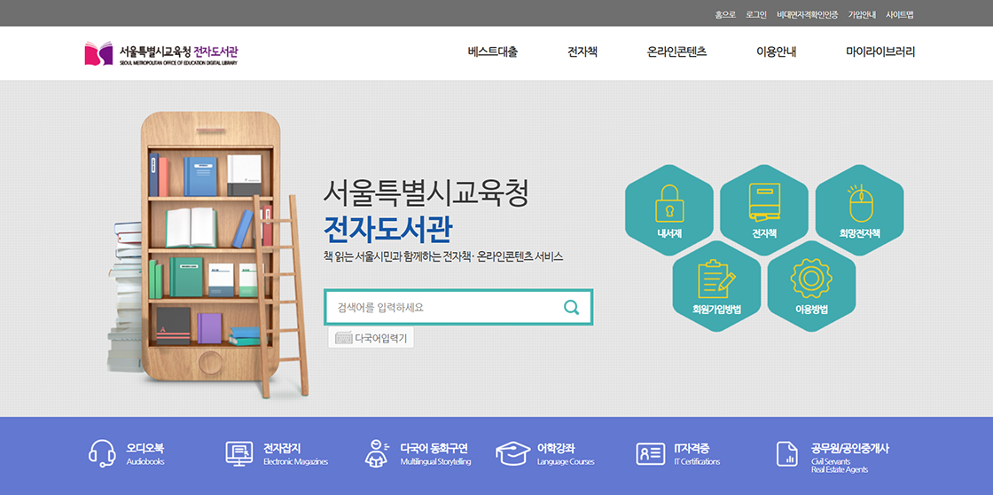 대표적으로 '서울특별시교육청 전자도서관'이 있습니다. 홈페이지 가입 후 서울 시민 인증을 하면 이용할 수 있습니다. 주민등록상 거주지가 서울이거나 서울에 재직 또는 재학 중이신 분만 이용할 수 있어요.