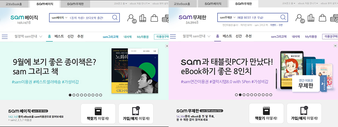 교보 eBook 홈페이지에서는 베이직과 무제한으로 이용권이 나뉘는데요, sam베이직 이용권은 매월 일정 금액으로 정해진 권 수만큼 전자책을 읽을 수 있으며, sam무제한 이용권은 매월 일정 금액으로 제한 없이 30일간 전자책을 읽을 수 있습니다.