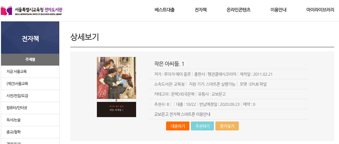 ‘대출하기’를 클릭하면 대출이 완료됩니다. PC에서는 뷰어를 설치해야 읽을 수 있고, 모바일로는 서울시교육청 전자도서관 앱이나 교보문고 전자도서관 및 북큐브 앱 등을 설치하면 됩니다. 개인별 최대 대출 권수는 5권이며 대출 기간은 7일이고, 대출 기간이 지나면 자동으로 반납 처리된다고 합니다.