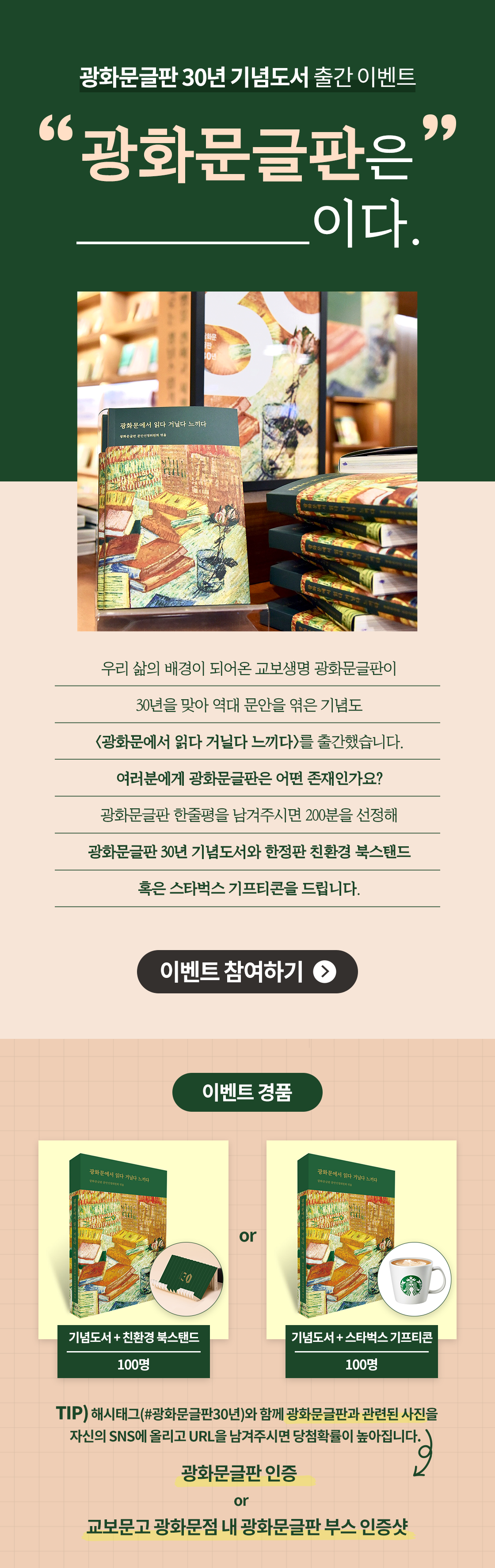 '광화문글판 30년 기념도서와 한정판 친환경 북스탠드' 혹은 '스타벅스 카푸치노 기프티콘'을 드립니다.