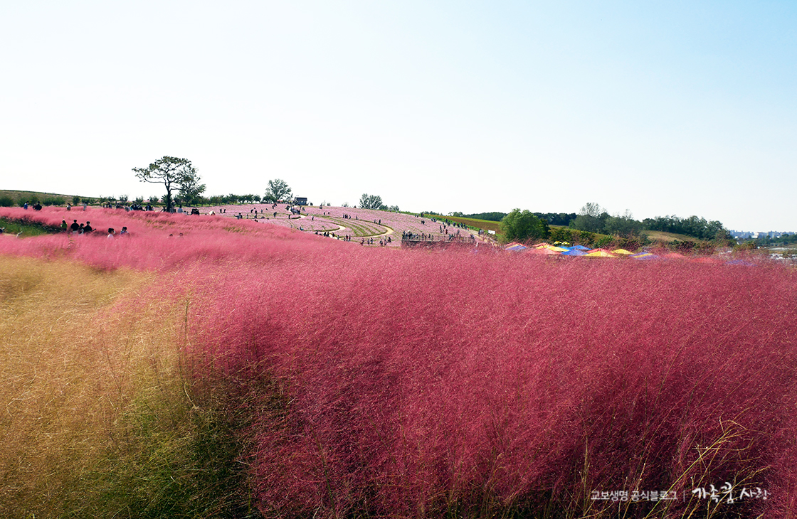 푸른 하늘 아래 가득 피어난 핑크뮬리를 직접 보니, 왜 가을을 대표하는 대세 식물이 된 이유를 알 것 같습니다. 바람에 살랑살랑 흔들리는 핑크뮬리를 보고 있으면 저절로 마음이 몽글몽글해지고 아름다운 동화 속에 들어온 기분이 듭니다.