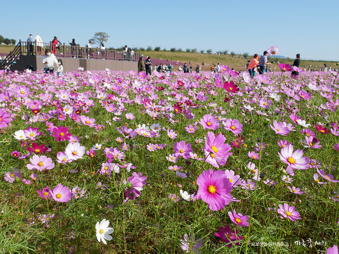 핑크뮬리 동산 옆에는 가을의 상징 코스모스 밭이 있습니다. 여름부터 피기 시작해 절정을 향하고 있는 흰색과 분홍색의 코스모스 밭도 지나칠 수 없는 포토존입니다.