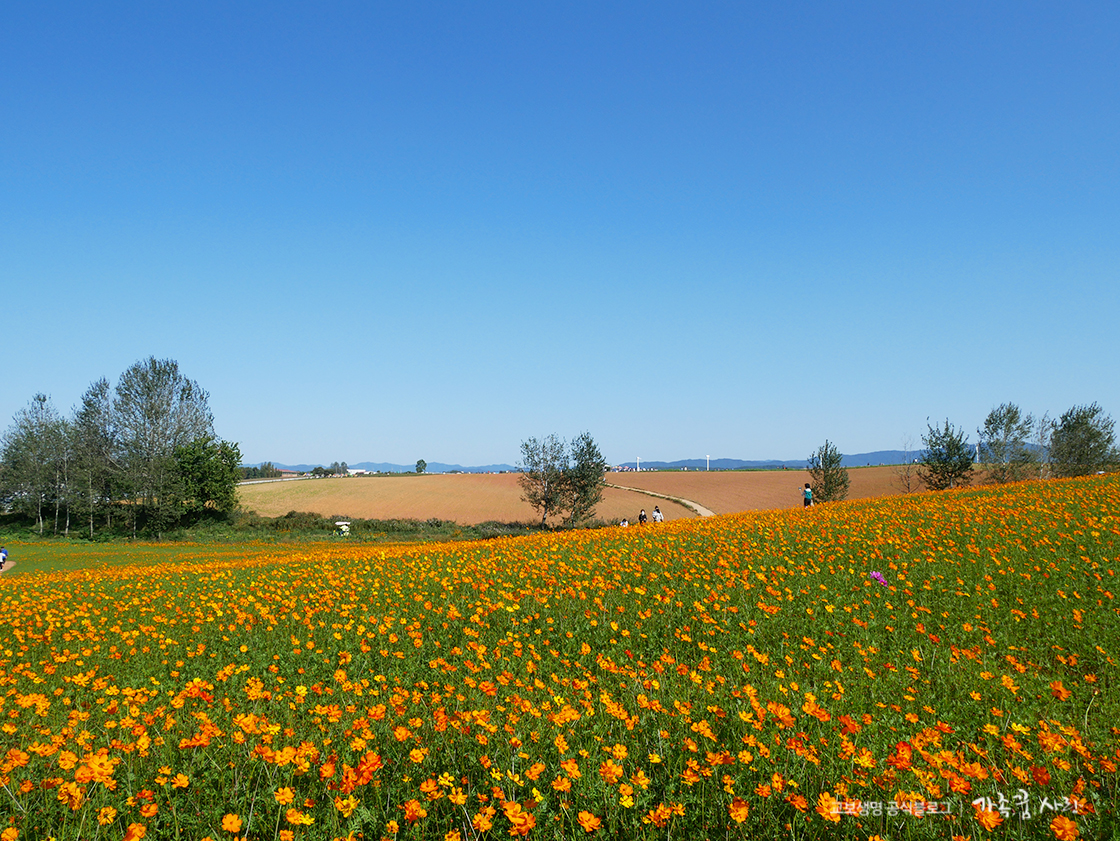 지평선까지 가득 핀 황화 코스모스 풍경은 감탄이 절로 나옵니다! 핑크뮬리의 몽환적인 느낌과는 많이 다릅니다. 포근하고 편안한 느낌을 주는 황화 코스모스는 가을의 매력을 한 가득 보여줍니다.