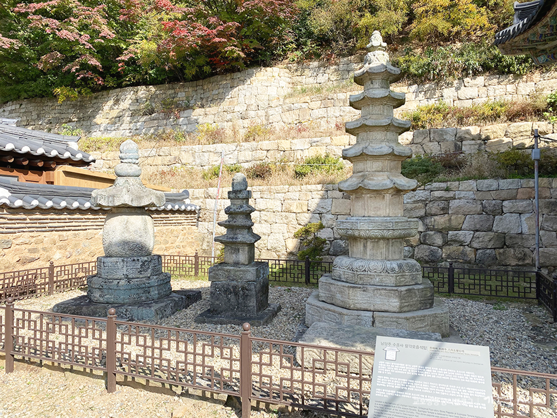 수종사에는 세 개의 석탑이 나란히 줄지어져 있는 것을 볼 수 있는데요. 이 중 2개가 보물로 지정돼 있습니다. 가운데 있는 탑은 3층 석탑을 중심으로 왼쪽에 있는 탑이 보물 제2013호인 태종 이방원의 딸 정혜 옹주를 위한 사리탑입니다. 3층 석탑 오른쪽에 있는 탑은 보물 제1808호인 팔각오층석탑입니다. 1957년 팔각오층석탑을 해체, 수리할 때 19구의 불상이 발견됐고, 1970년 이전할 때는 12구의 불상이 되어 현재 불교중앙박물관에서 소장 중입니다.